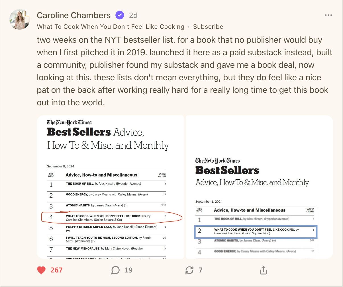 Recipes largely dominate the Food & Drink Leaderboard on Substack - now easily found with the rapidly developing product of Tabs, on the app Homepage. And most of the recipes aren’t coming from Restaurants and Chefs - they are coming from a lot everyday folks2 who once got turned away from big publishers to eventually finding themselves on the New York Times Best Sellers list. Please know this is in no way an endorsement of being overly concerned with stats and chasing accolades3 - because both can be rife with problematic consumption, performance and greed. However, opportunity due to a lower barrier to entry into a more creative life is possible here - so Chefs, whether you want to write recipes or tell old industry stories (hint: 80s and 90s nostalgia is hot right now, y’all!) - Start a Substack.